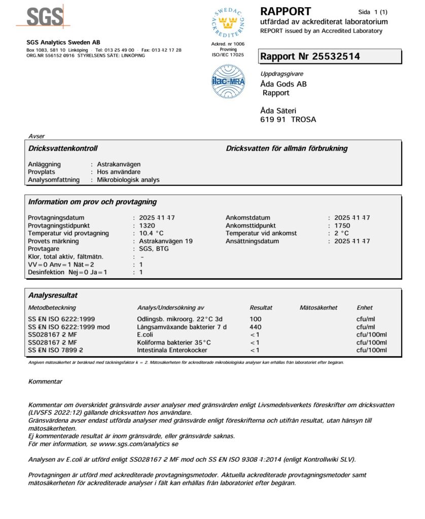 Dricksvattenkvalitet är en central del av vår produktion och förutom filter, avhärdning och uv så tar vi givetvis regelbundna prover för att säkerställa att allt är som det ska vara. Vi tar både ett kemiskt och ett mikrobiologiskt prov vid samma tillfälle.